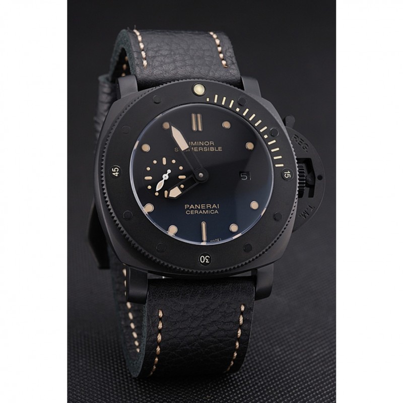 Panerai Luminor Submersible Black Dial Black Case Black Leather Strap Replica Watches